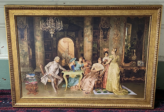 A local artist and regular customer of Hangin', Courtney Hiersche, takes found oil paintings and adds whimsical touches to create a new narrative in the image.